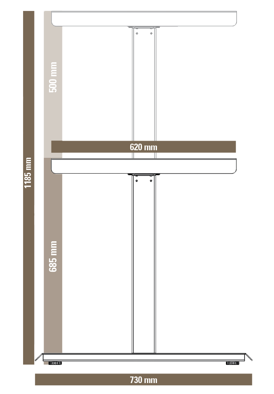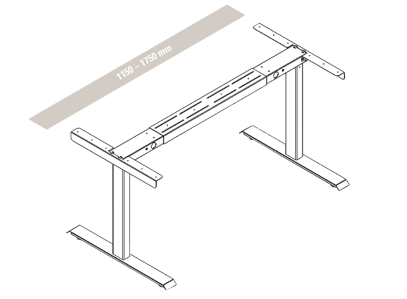 Hub: 500 mm, Gestellhöhe: 685 – 1185 mm, Geschwindigkeit: 38 mm pro Sekunde, Belastung: 500 N pro Säule, Rahmenbreite: 1150 – 1750 mm, Rahmentiefe: 620 mm, Säulentyp: LINAK DL5IC, Kollisionsschutz: nein.