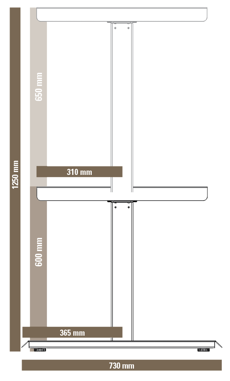 Hub: 650 mm, Gestellhöhe: 600 – 1250 mm, Geschwindigkeit: 38 mm pro Sekunde, Belastung: 800 N pro Säule, Rahmenbreite: 1150 – 1750 mm, Rahmentiefe: 620 mm, Säulentyp: LINAK DL6, Kollisionsschutz: ja.