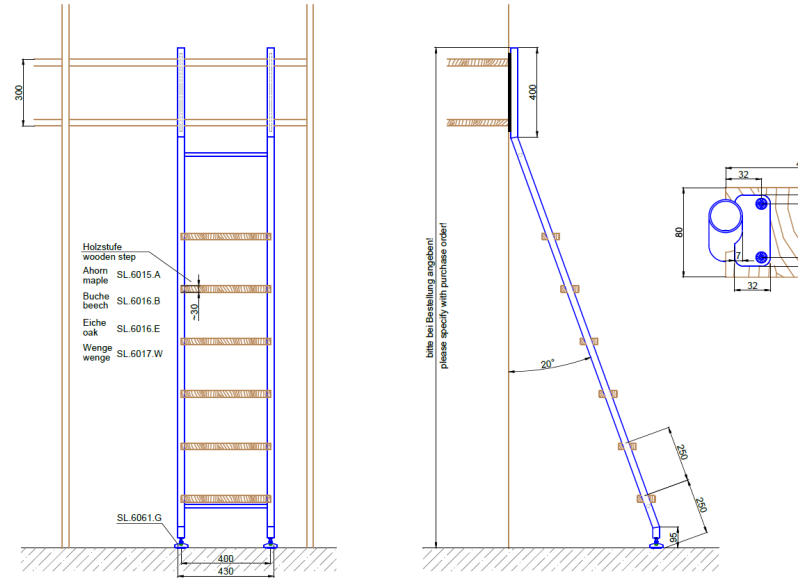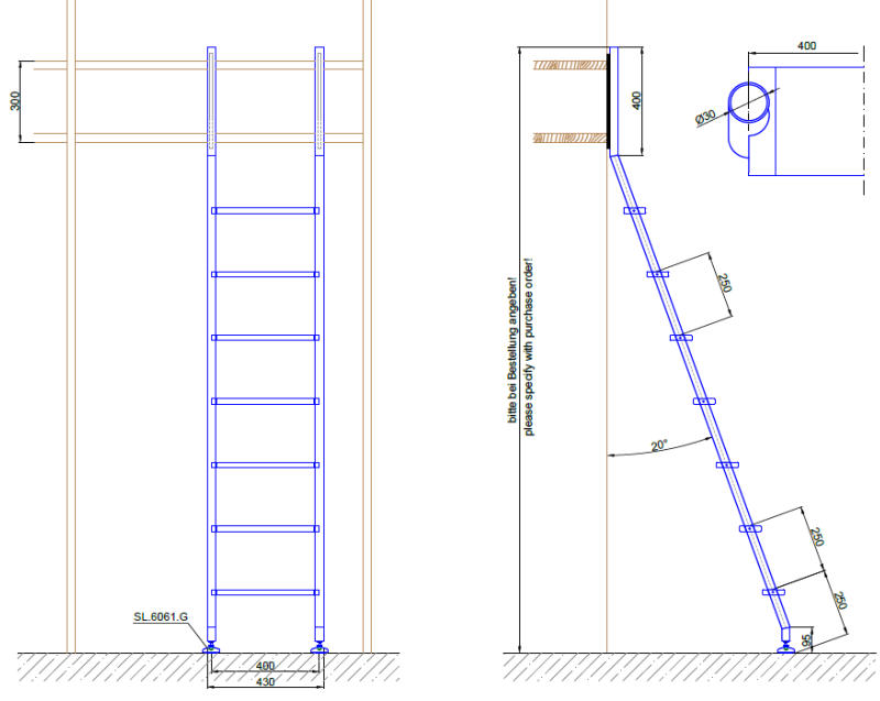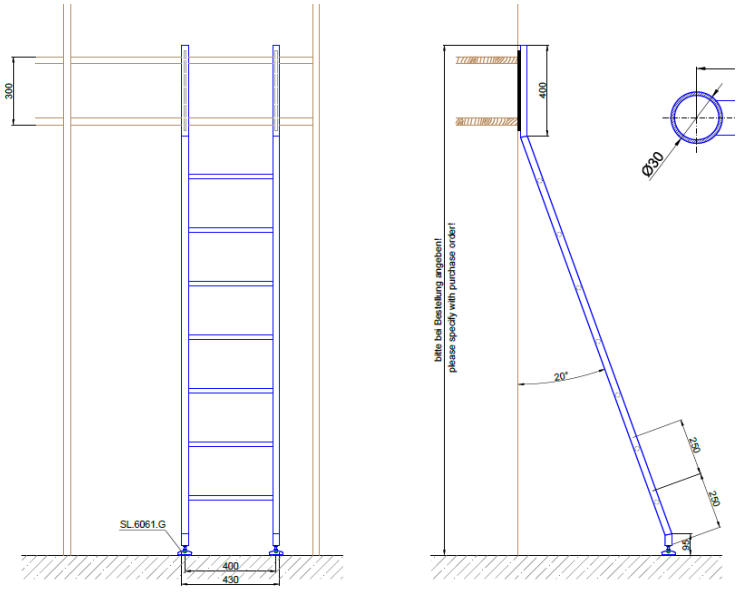 Die Anlegeleiter hat einen Anstellwinkel von 20 Grad, die Anzahl der Sprossen oder Stufen sind separat festzulegen bzw. zu bestellen.