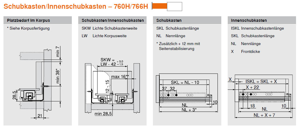 Platzbedarf im Schrank = Nennlänge der Führung + 3mm.
