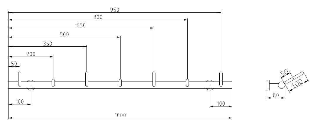Gesamtlänge 1000mm, Befestigungen Abstand 800mm, Durchmesser der Stange 30mm, Ausladung 4 Haken 100mm, 3 Haken 50mm.
