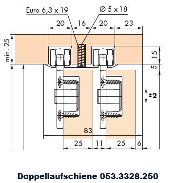 Clipo26-2 best. aus: Beschlagsgrt. 53.3353.071 + Doppellaufschiene 53.3328.250 + Führungsschiene 53.3074.250 für 2 Türen bis 26kg.
