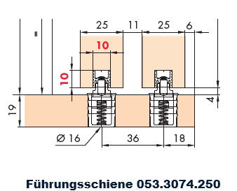 Clipo36-2 best. aus: Beschlagsgrt. 53.3353.072 + Doppellaufschiene 53.3328.250 + Führungsschiene 53.3074.250 für 2 Türen bis 36kg.