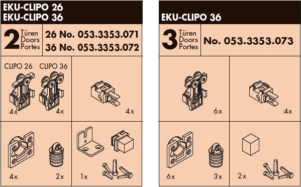 Clipo36-3 best. aus: Beschlagsgrt. 53.3353.073 + Doppellaufschiene 53.3328.250 + Führungsschiene 53.3074.250 für 3 Türen bis 36kg.