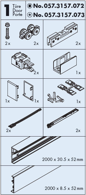Die Laufschiene 2000x30,5x52mm mit Blendenprofil 2000x8,5x52mm in den Oberflächen EV1 eloxiert oder Edelstahl-Finish eloxiert.