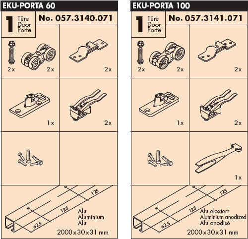 Deckenmontage - Komplettset Beschlagsgarnitur EKU PORTA 60/100H für 1 Holztür bis 60/100kg.