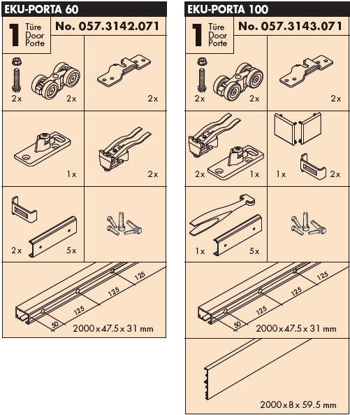 Wandmontage - Komplettset Beschlagsgarnitur EKU PORTA 60/100HC für 1 Holztür bis 60/100kg.