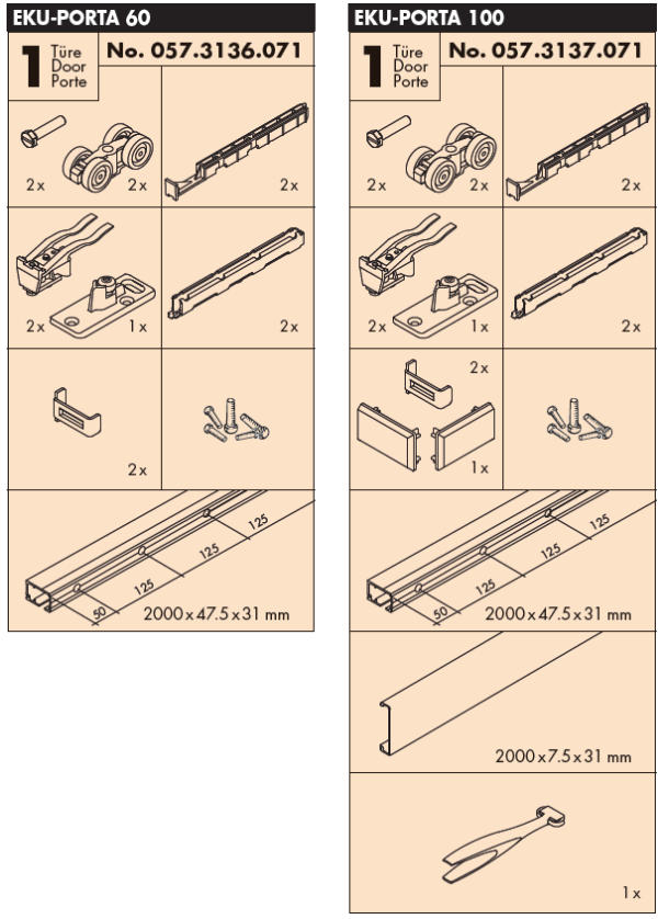 Wandmontage - Komplettset Beschlagsgarnitur EKU PORTA 60/100HMD für 1 Holztür bis 60/100kg.