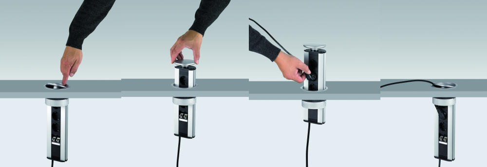 Einbau-Schutzkontakt-Steckdosenleiste 3-fach 16 Ampere mit Berührungsschutz, versenkbar.