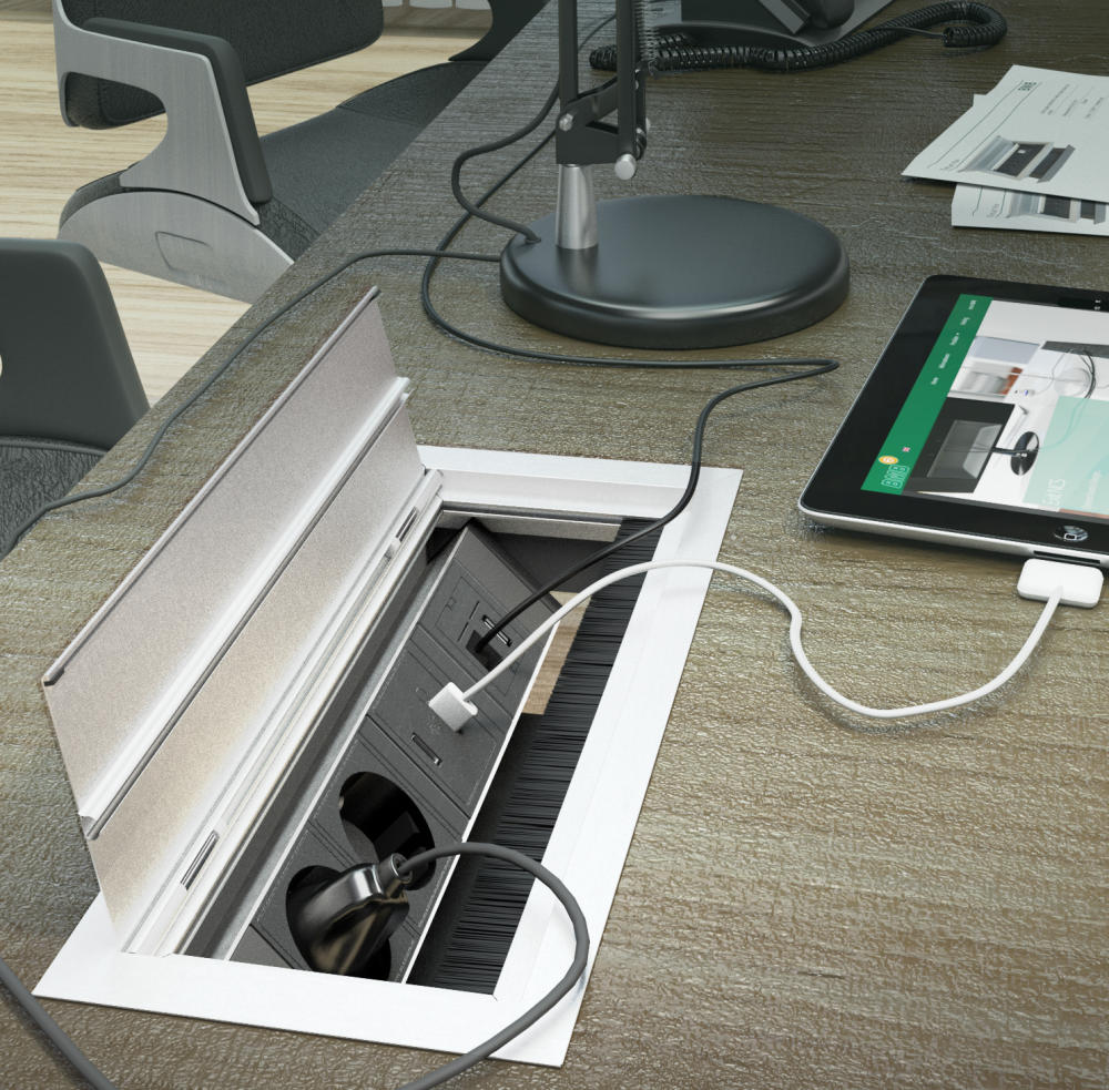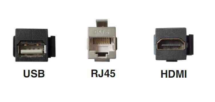 Einbau-Steckdoseneinheit Exit 45 Plus, Bestückung 2 x Steckdose und 2 x USB, zusätzlich 2 frei wählbare Steckplätze.