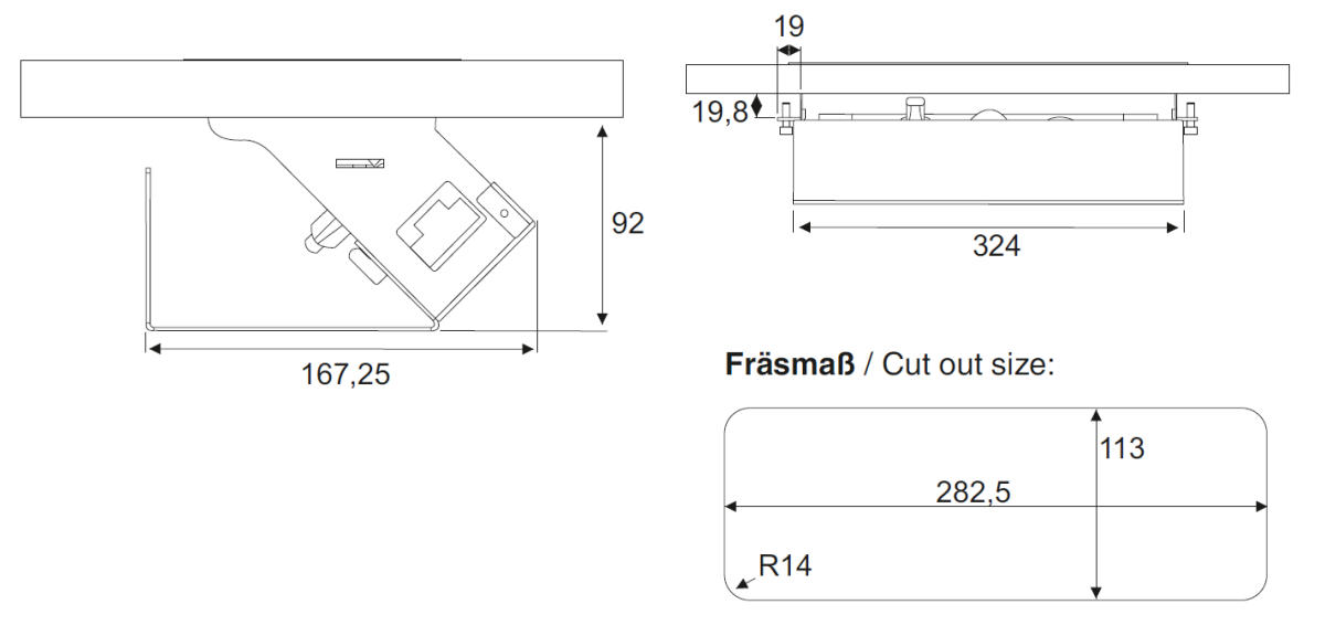 Außenmaße 289,5mm x 120mm, Tiefe 25mm. Einbaumaße 252,5mm x 113mm Einbautiefe 92mm,