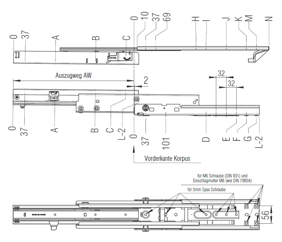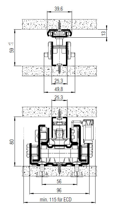 Für Bodenmontage, Einbaubreite min. 108mm / (mit ECD 115mm) , dynamische Belastung bis 120kg. Einzugsdäpfung (ECD) optional.