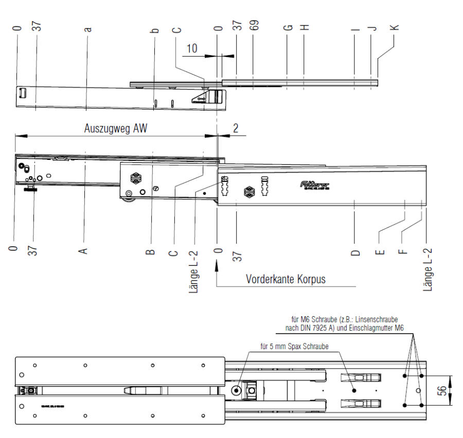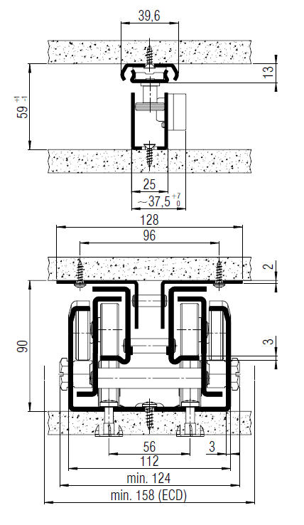 Für Bodenmontage, Einbaubreite min. 124mm / (mit ECD 158mm) , dynamische Belastung bis 200kg. Einzugsdäpfung (ECD) optional.
