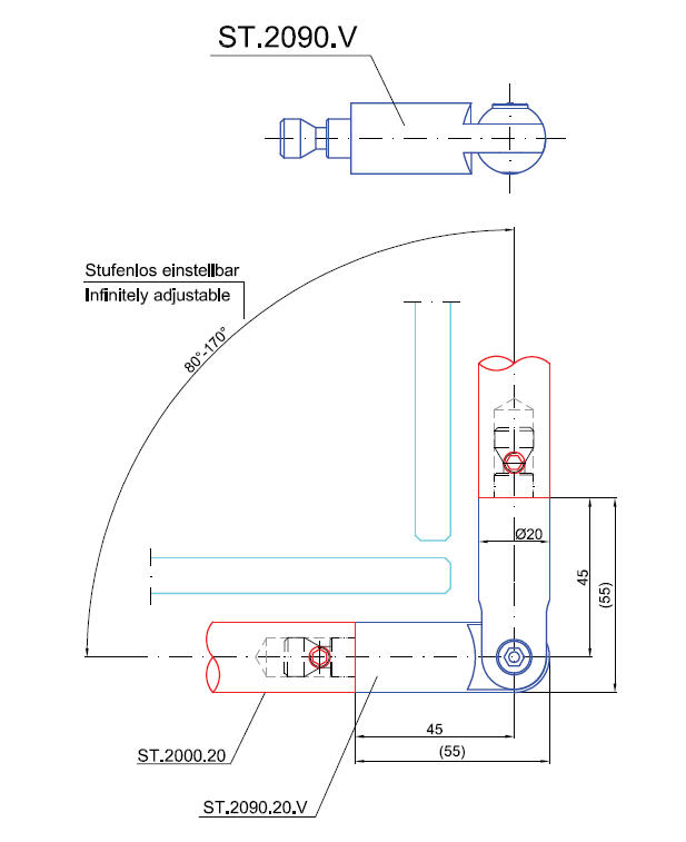 Gehrungsverbindung für Lauf- und Einhängeschienen Durchmesser 20mm, Schenkellängen 55 x 55mm, Edelstahl massiv Korn 600 geschliffen. Winkel einstellbar von 80-170°.