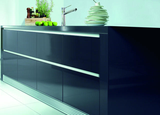 Grifflmuldenprofile füe den horizontalen Einsatz, Aluminium EV1, Edelstahl-Finish, Weiß RAL9010 und Schwarz RAL9005.