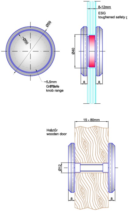 Bohrung in Glastüren Durchmesser 40mm, Bohrung in Holztüren Durchmesser 12mm.