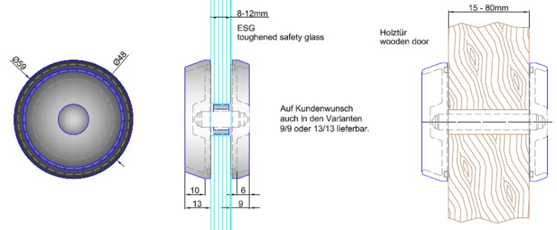 Bohrung in Glastüren Durchmesser 16mm, Bohrung in Holztüren Durchmesser 12mm.