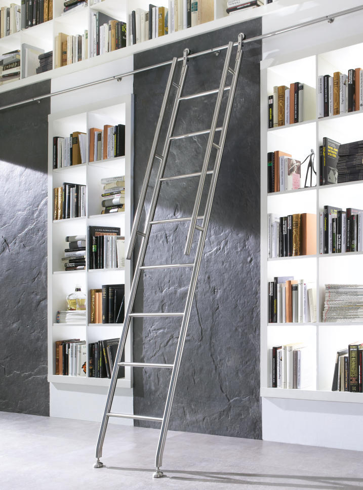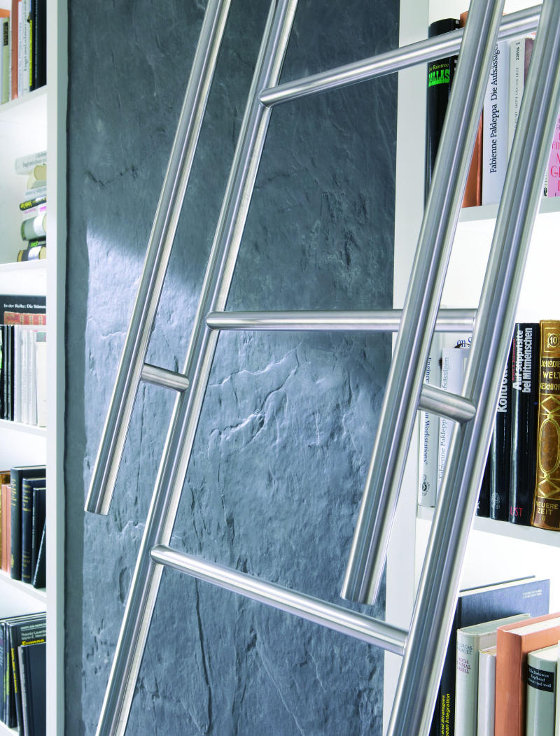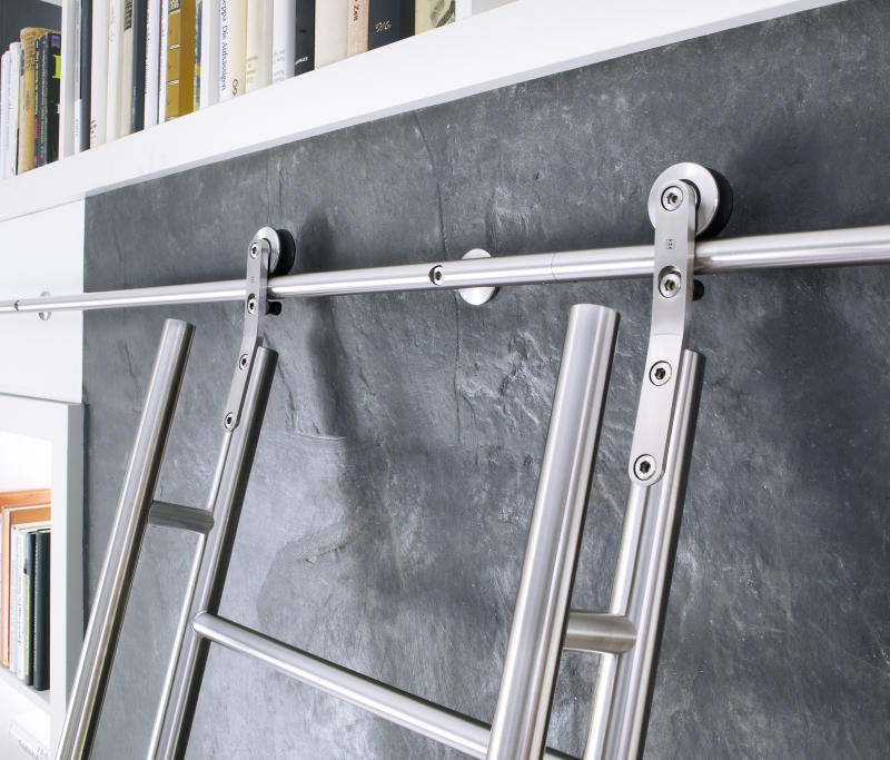 Handlauf für Bibliotheksleitern, ab Gesamthöhe von 3000mm aus sattischen und Sicherheitsgründen zwingend.