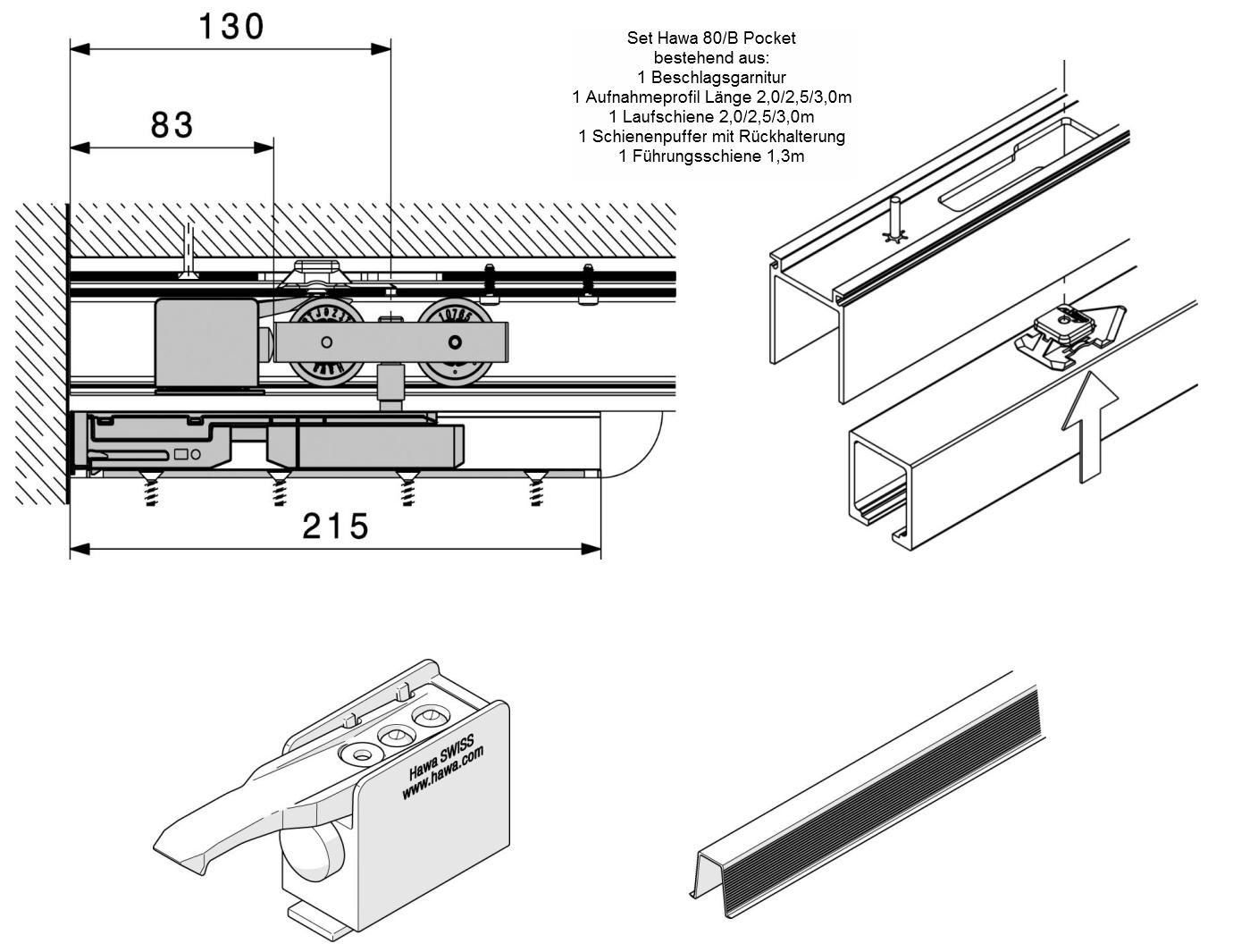 Pocket.80B.2000 - 1 Beschlaggarnitur Nr. 25074 + Aufnahmeprofil 2000mm Nr. 25207 + Laufschiene 2000mm Nr. 10192