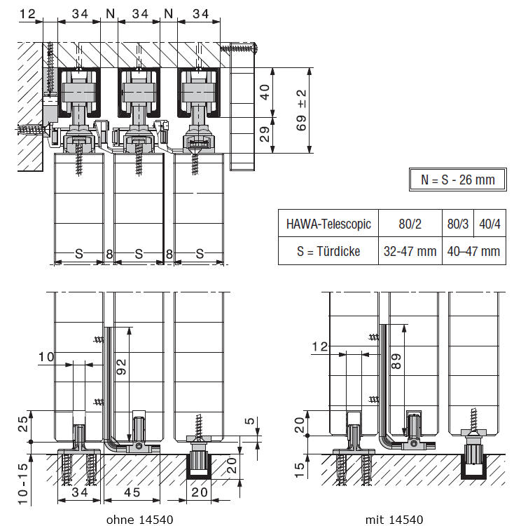 Hawa Telescopic 80/3 - Beschlagset für 3 Türen
