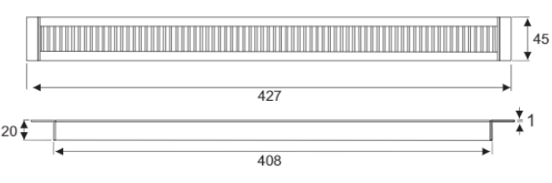 Kabeldurchführung Eckig "EXIT NCT" aus Aluminium mit eckigen Endkappen und mit schwarzer Bürstendichtung. Randmaße der Box: 45 x 427 x 20mm (Höhe Rand: 1mm), Fräsmaße: 39 x 408mm.