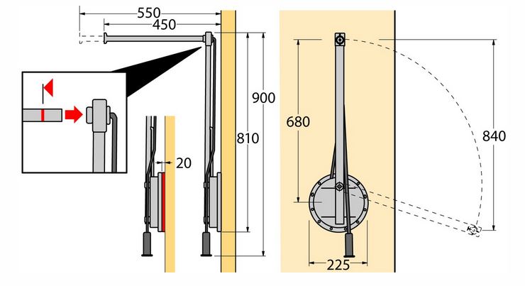 Gehäuse und Schwenkarm aus Kunstoff/Stahl, Kleiderstange aus Stahl