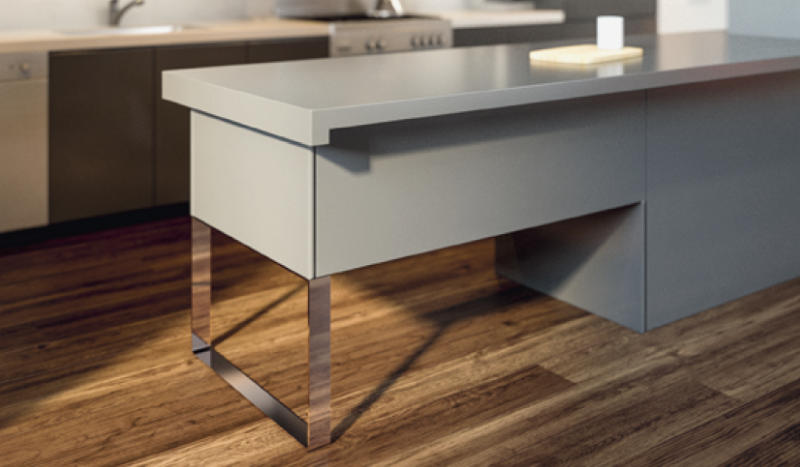 Kufensystem für Kücheninsel, Profil 60x8mm in Edelstahl matt gebürstet oder Stahl verchromt poliert.