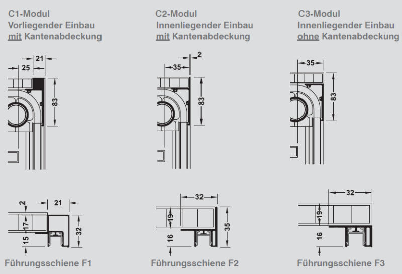 Führungsprofile Aluminium (F1, F2, F3) nach Wahl und Blendenprofil.
