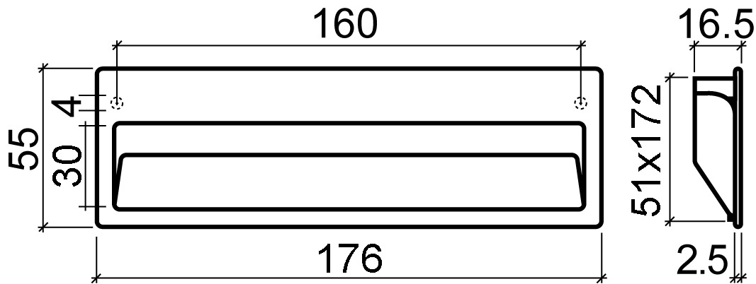 Außenmaße 176x55mm, Einlassmaße siehe Zeichnung.