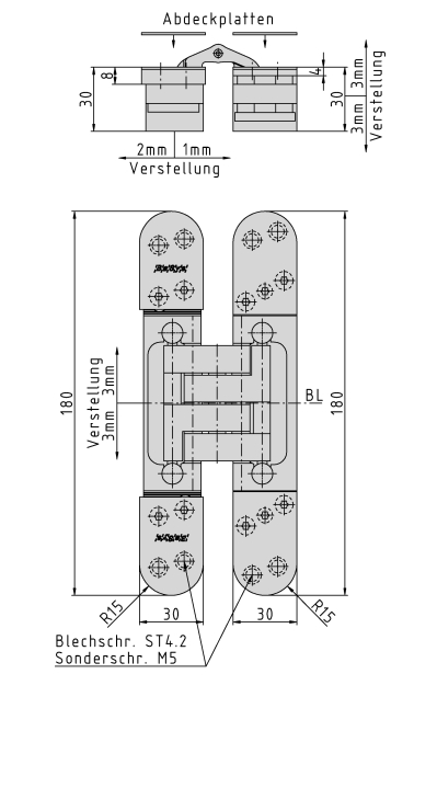 Anwendung: stumpf einschlagende Türen, bei geschlossener Tür ist das Band unsichtbar; 3-dimensionale Verstellung,