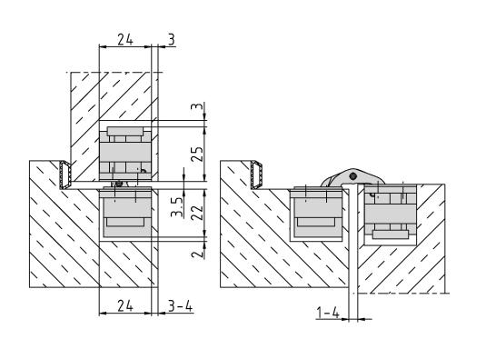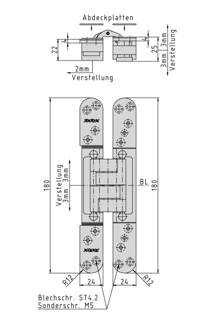 Anwendung: stumpf einschlagende Türen, bei geschlossener Tür ist das Band unsichtbar; 3-dimensionale Verstellung,