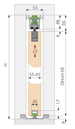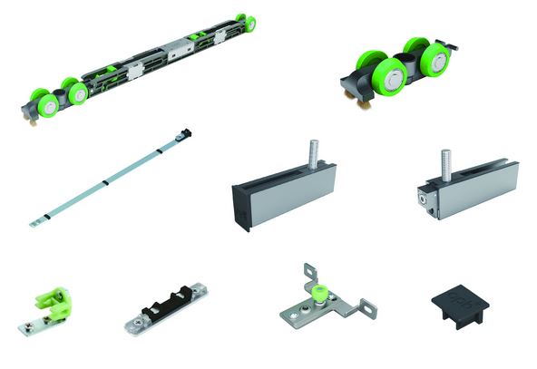 Schiebetürsystem SPACESHIP Ausführung Pocket mit beidseitiger Dämpfung, für Holztüren 35 - 45 mm, ab Türbreite 580mm / bis Türgewicht 80 kg, Höhenverstellung ±3mm.