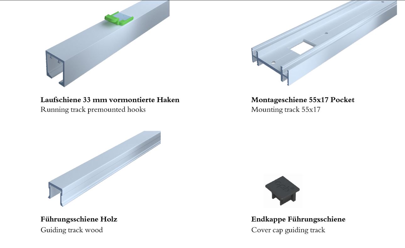 1 Laufschiene Aluminium eloxiert mit Wandbefestigungen, Verblenden der Laufschiene möglich, verschiedene Längen verfügbar - bitte auswählen