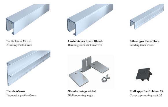 1 Laufschiene Aluminium eloxiert mit Wandbefestigungen, Verblenden der Laufschiene möglich, verschiedene Längen verfügbar - bitte auswählen