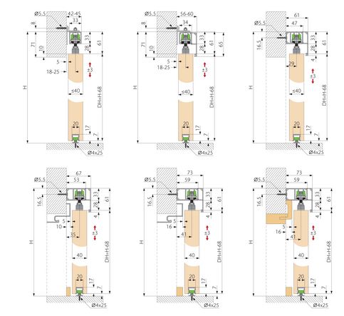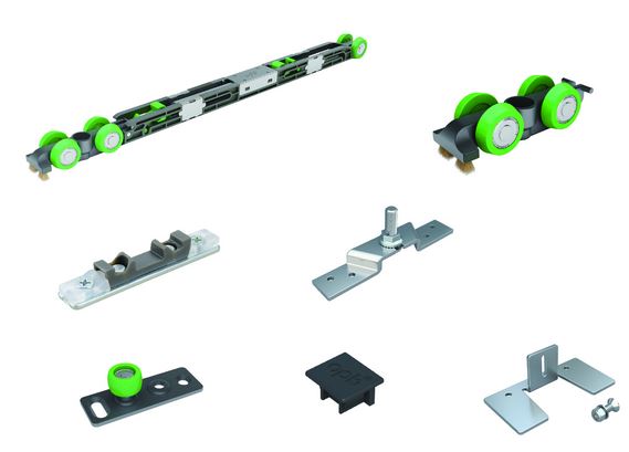 Schiebetürsystem SPACESHIP Ausführung Wandmontage mit beidseitiger Dämpfung, für Holztüren 35 - 45 mm, ab Türbreite 580mm / bis Türgewicht 80 kg, Höhenverstellung ±3mm.