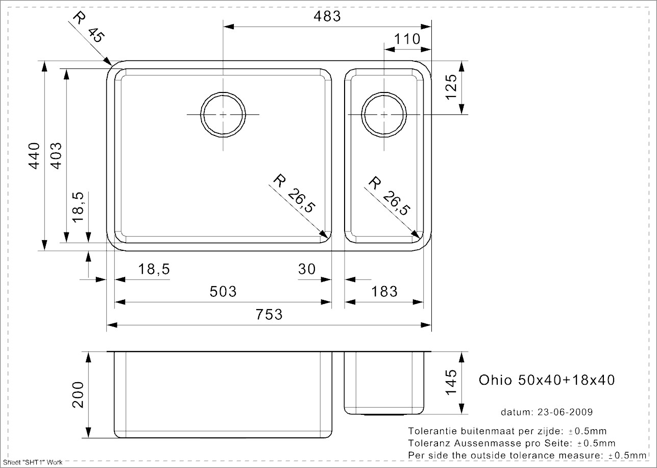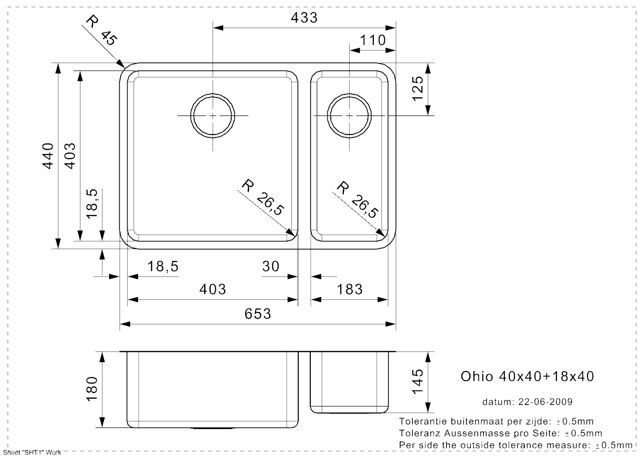 Edelstahlspüle Seidenglanz Innenradius 25mm, Außenradius 45mm mit Siebkorbventil 3,5", geeignet für Unterbau, Flacheinbau und flächenbündigen Einbau.