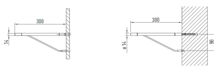 Tablarträger / Bodenträger Durchmesser 14mm, Ausladung 300mm, für Wand- und Paneelmontage inkl. Montagematerial, Lieferung ohne Glas.