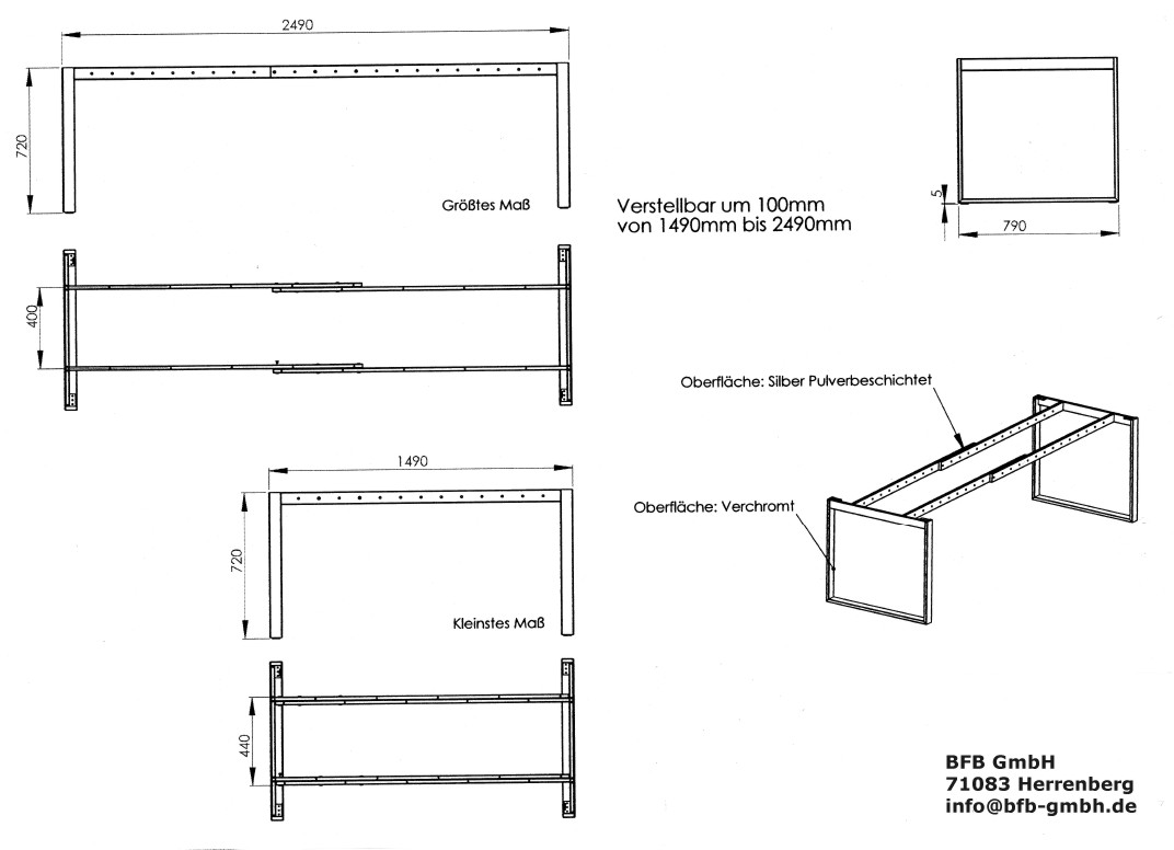 Höhe 720mm, Breite 790mm, Länge von 1490-2490mm verstellbar. Lieferung ohne Tischplatte